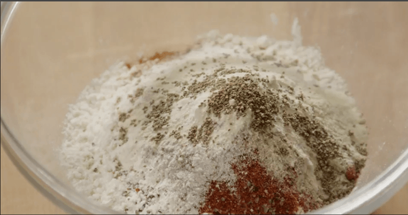 Bước 3: Dùng một chiếc bát to, cho các nguyên liệu ở phần chuẩn bị vào rồi trộn đều. Chú ý rây bột trước. Sau đó cho hạt tiêu, muối, ớt bột, bột hành tây, bột tỏi và hạt cần tay vào.