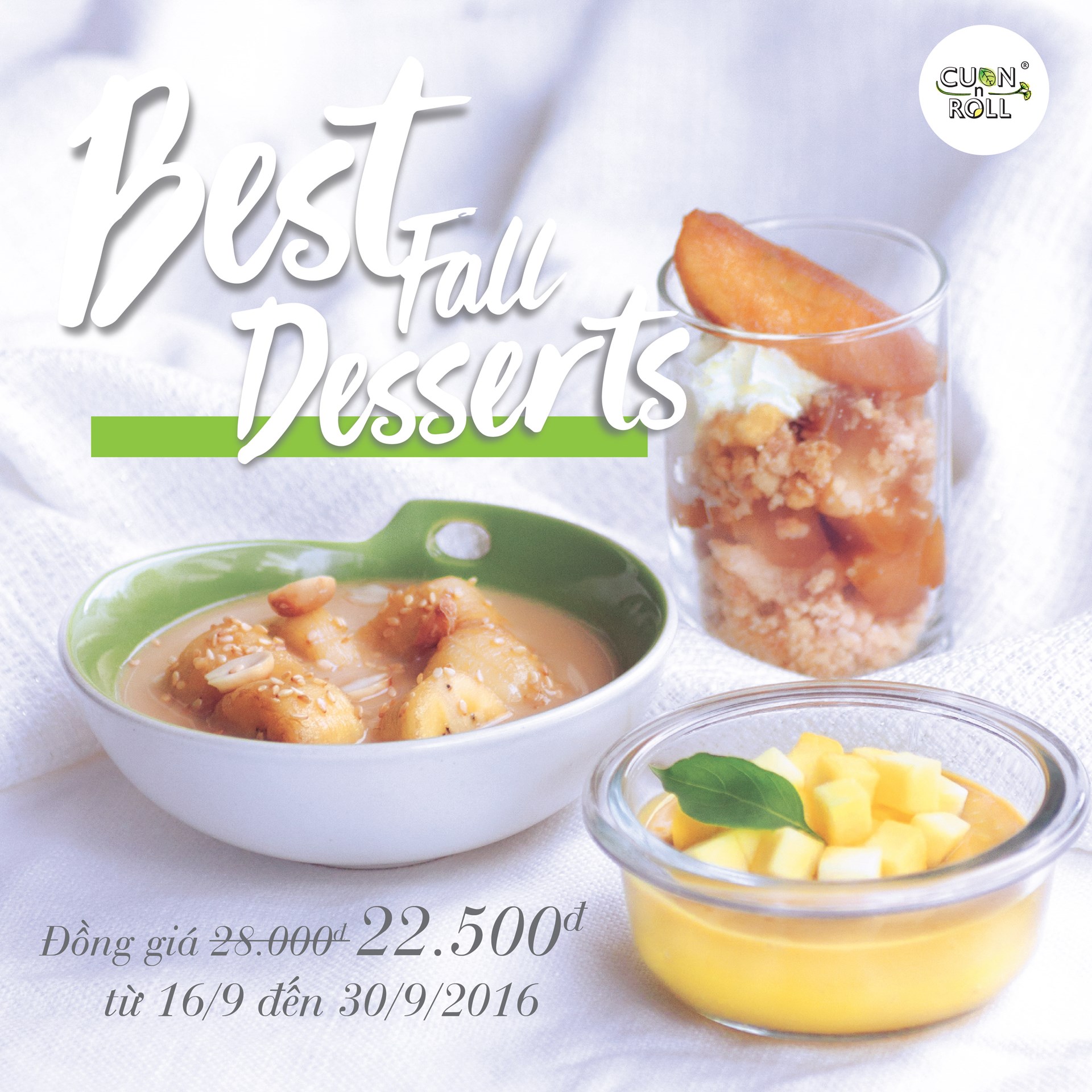 Chỉ với 22,500đ, bạn sẽ được thưởng thức ngay 3 món tráng miệng trong menu mới của Cuốn N Roll. Thời gian áp dụng: 16/09 – 30/09/2016