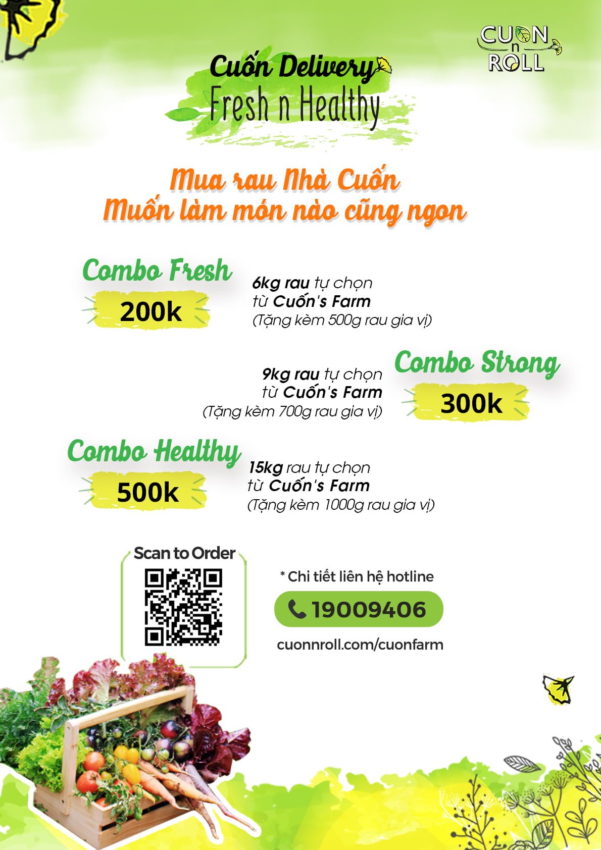 - Combo Fresh – 200k: 6 kg rau tự chọn từ Cuốn’s Farm (Tặng kèm 500g rau gia vị)