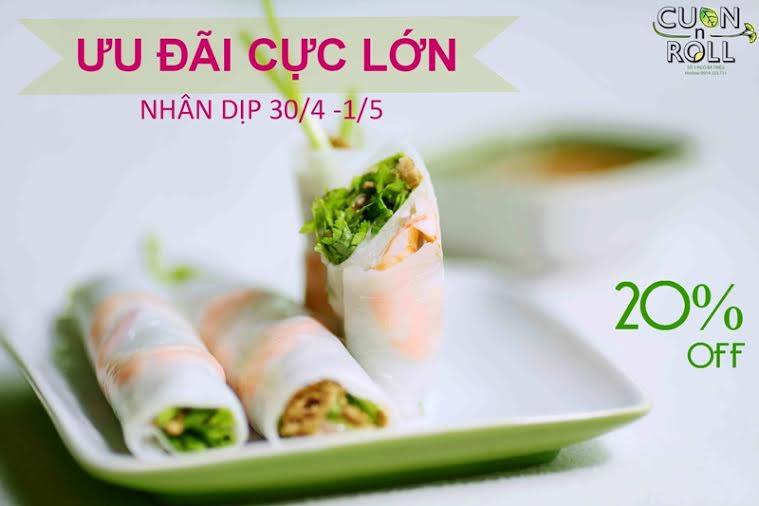 Nhân dịp lễ 30-4 và Quốc tế lao động 1-5, nhà hàng Cuốn N Roll GIẢM GIÁ 20% cho khácch hàng từ ngày 25/04 đến 01/05.