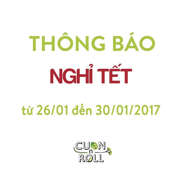 CUỐN N ROLL xin thông báo Cuốn sẽ bắt đầu đóng cửa nghỉ Tết từ ngày 26/01/2017 (tức 29 Tết) đến 30/01/2017 (tức mùng 03 Tết).