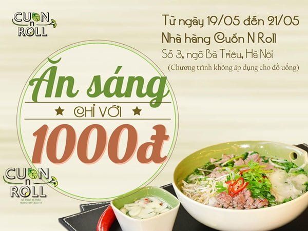 Trong khung giờ 7h00-9h00 vào 3 ngày đó Cuốn N Roll đã phục vụ hai món ăn mà theo như Trang đây là hai món cô “tâm huyết” nhất và đã phải thực hành rất nhiều lần mới cho ra được bát phở hay tô mỳ vừa ý. Thay vì bỏ ra 30 đến 40.000 đến với Cuốn N Roll vào 3 ngày này, các khácch hàng chỉ phải bỏ ra 1000 đồng là đã có bữa sáng vừa ngon vừa no căng lại được ngồi trong không gian sạch sẽ và thoáng mát. Vì thế, trong 3 ngày qua, Cuốn N Roll mỗi buổi sáng lại đón hơn 500 lượt khách tham gia chương trình.