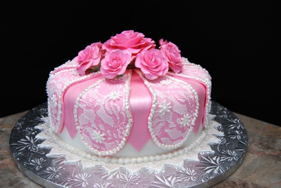 Mẫu bánh này khác thích hợp cho những cô công chúa nhỏ trong gia đình. Phần hoa hồng phủ kín mặt bánh, họa tiết tinh tế, vòng hạt khiến cho chiếc bánh thêm nổi bật.