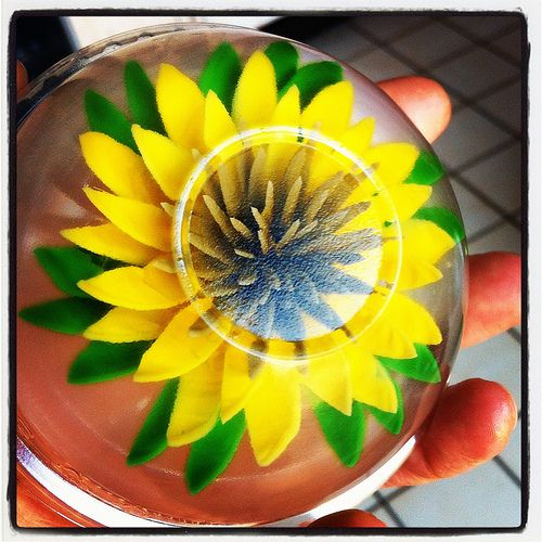 – Dùng thìa khía chéo tạo hình cánh hoa, giữ nguyên hình dáng thìa khi ấn. Dùng bơm tiêm (đã có nước thạch màu), bơm vào giữa khe của thìa và lớp thạch trong. Hoặc thực hiện cách khácc là dùng thìa khoét một rãnh nhỏ tạo hình cánh hoa trong bát thạch, rút thìa ra rồi bơm màu vào.