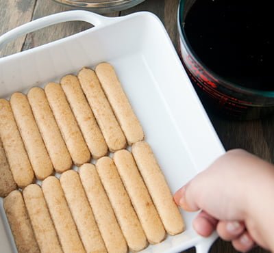 – Bạn chuẩn bị sẵn bánh champagne, nhúng qua một lớp cà phê espresso rồi xếp ra khay.