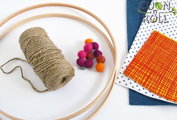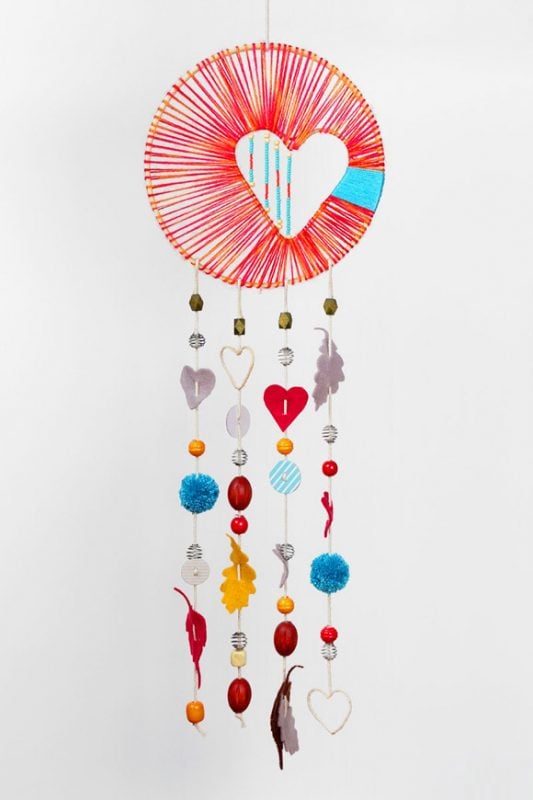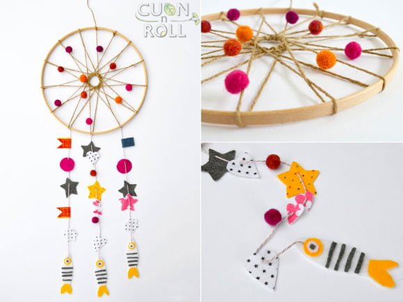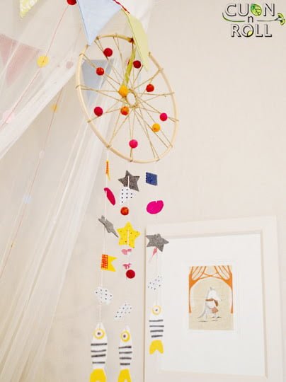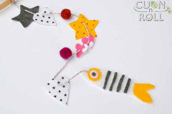 Bạn cắt thật nhiều mẫu hình con cá, trái tim, bông hoa…nhỡ ra bằng vải nỉ rồi dán chúng cùng một vài quả bông len lên đoạn dây thừng dài tầm 20-30cm.
