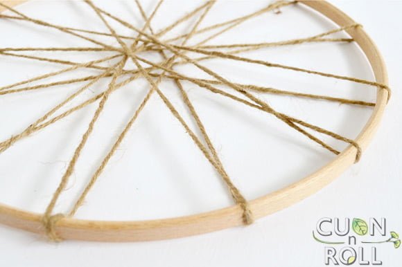 Đầu tiên, bạn đan lên khuôn tròn với sợi dây thừng bằng cách quấn mỗi đoạn 2 vòng qua tâm khuôn tròn và cách đều nhau (như hình).