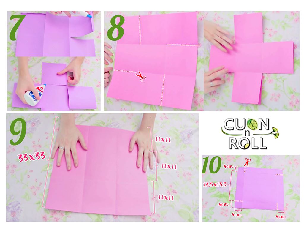 Bước 10: – Để làm nắp hộp, bạn dùng một tờ giấy kích cỡ 17.5×17.5cm, đường viền bên ngoài dày 4cm. – Dùng kéo cắt các đường như hình sau đó dùng keo dán các viền lại để tạo thành nắp hộp.
