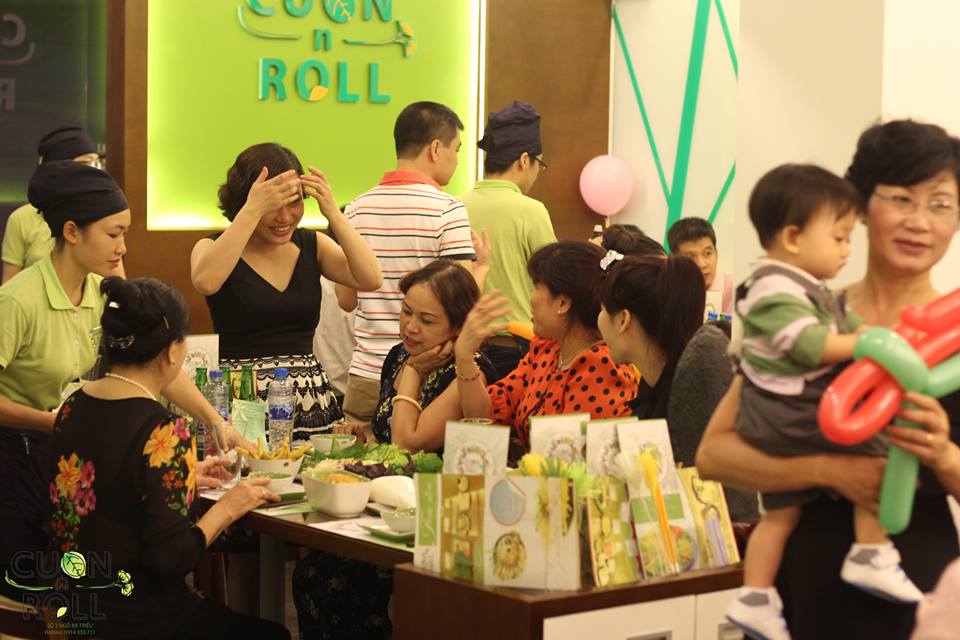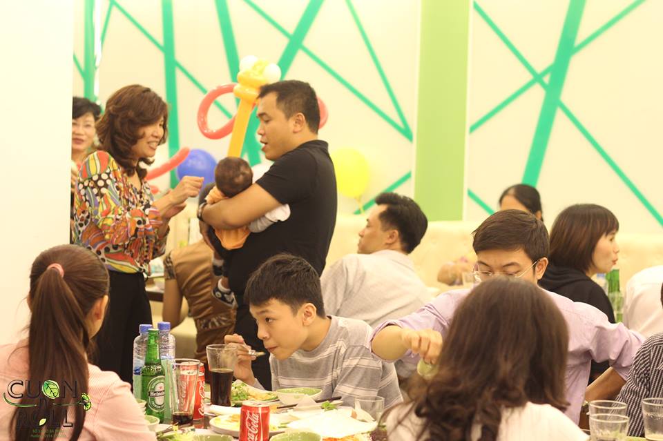 Người lớn thì trò chuyện sôi nổi bên bàn ăn trong lúc một loạt các món cuốn hấp dẫn