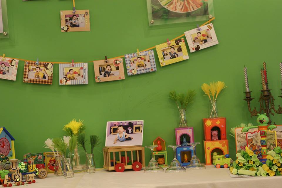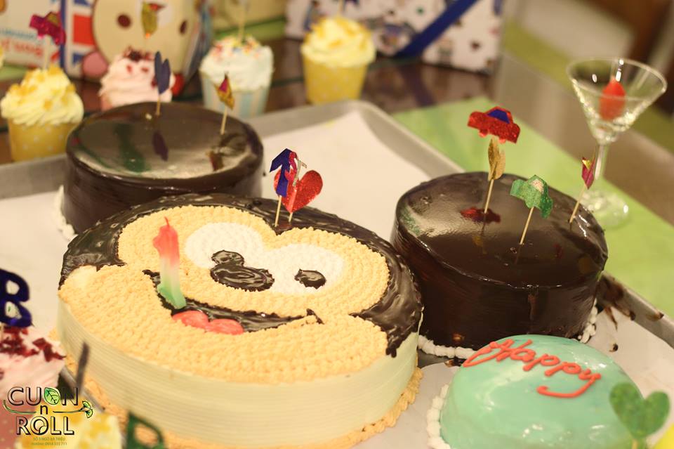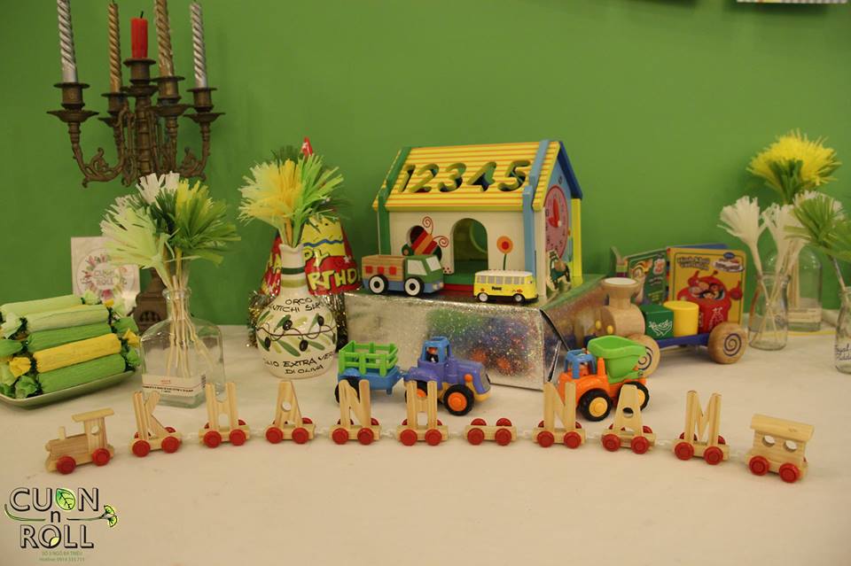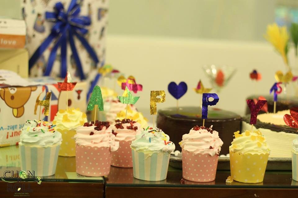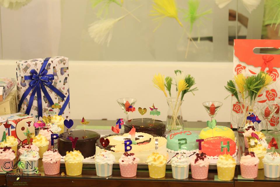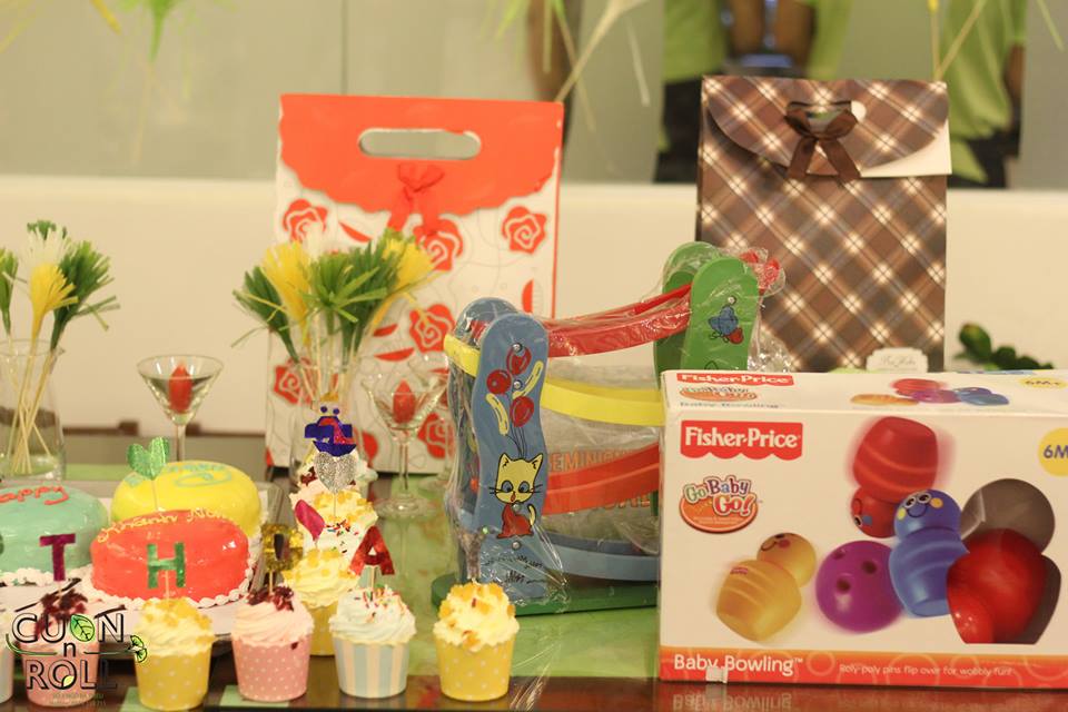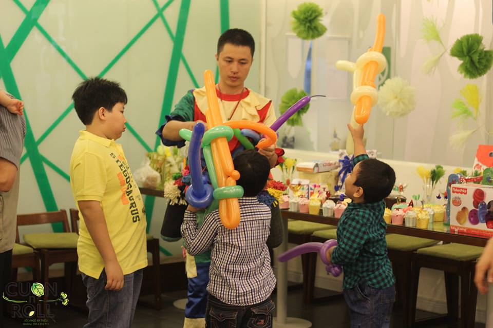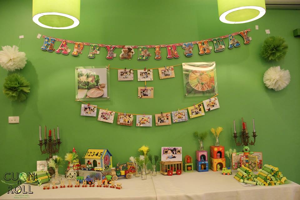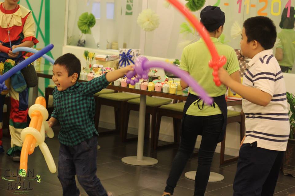 Bữa tiệc được đặt trong một không gian sinh động, đẹp đẽ và ấm cúng, rộng khoảng 200m2, nằm ở tầng 1 của nhà hàng. Trên chiếc bàn gỗ xinh xắn, cũng là trọng tâm của căn phòng, rất nhiều đồ chơi trẻ con như chiếc nón chú hề đặc trưng, lọ hoa nhiều màu và chiếc kẹo handmade bằng giấy được các bạn nhân viên Cuốn n Roll khéo léo chuẩn bị và bày biện cẩn thận từ rất sớm.