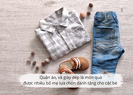 Quần áo, và giày dép là món quà được nhiều bậc phụ huynh lựa chọn dành tặng cho các bé. Với bé trai, bạn nên chọn quần áo có màu sắc cá tính, cũng như phong cách mạnh mẽ. Ví dụ những màu trung tính như màu xanh, màu trắng,… Còn đối với giày dép nên chọn loại có thiết kế năng động và thoải mái, thích hợp cho các hoạt động vui chơi của bé.