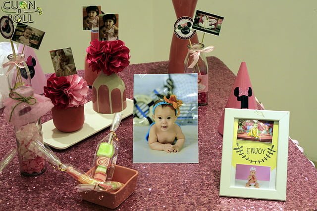 Mỗi năm lớn lên bé đều có những khoảnh khắc đặc biệt đánh dấu một năm của mình, mẹ hãy chọn 3 – 5 khoảnh khắc đáng yêu nhất và rửa ảnh để khung đặt trên bàn trang trí sinh nhật bé. Mẹ cũng có thể rửa nhiều ảnh nhỏ và treo vào kẹp ảnh gỗ treo qua 2 cạnh bàn!