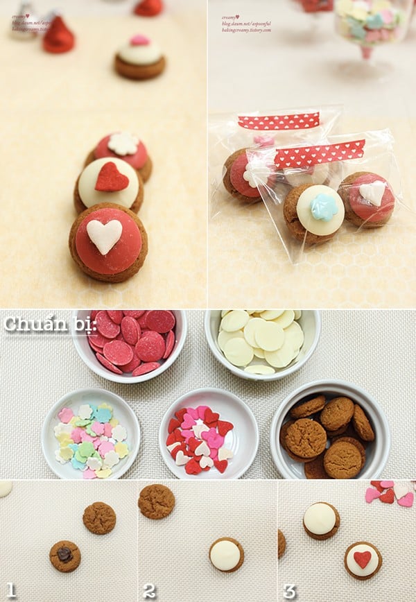 Bạn chỉ cần đi mua một ít kẹo màu rồi dùng sô cô la đun chảy gắn lên những chiếc bánh quy thông thường là đã có một món quà không đụng hàng rồi. Xong xuôi thì gói bánh vào túi nilong trong, bạn có thể trang trí bằng ruy băng màu để món quà trông đáng yêu hơn nhé!