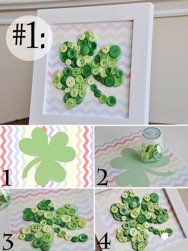 Với món quà handmade này, bạn chỉ cần in hình cỏ 3 lá lên giấy, dùng keo dán cúc áo tone màu xanh đậm – nhạt kín lên trên mẫu. Sau đó, mình lồng tấm giấy vào khung tranh là xong nhé!